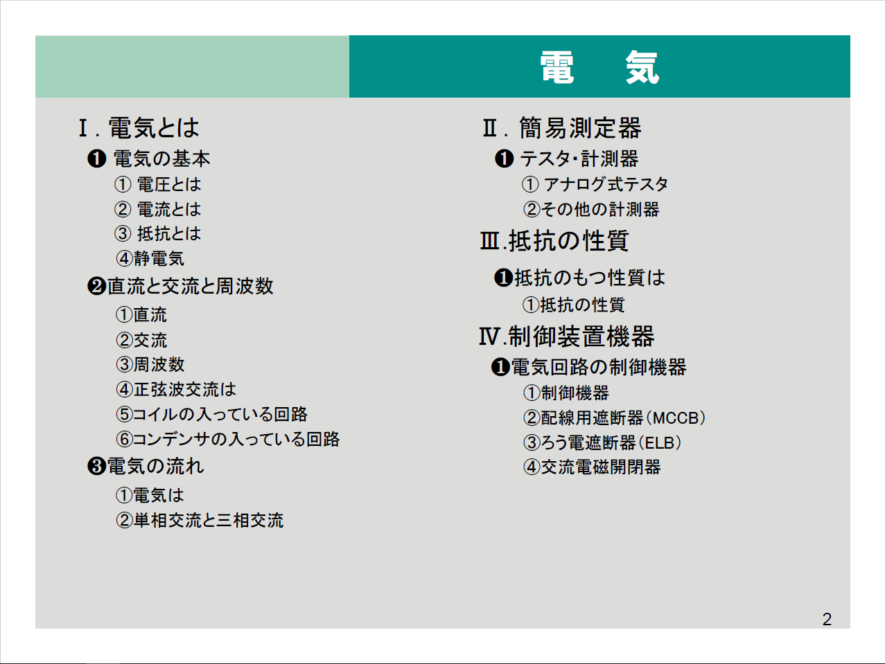 | ➊ 電気の基本 ① 電圧とは ② 電流とは ③ 抵抗とは ④ 静電気 ➋ 直流と交流と周波数 ① 直流 ② 交流 ③ 周波数 ④ 正弦波交流は ⑤ コイルの入っている回路 ⑥ コンデンサの入っている回路 ➌ 電気の流れ ① 電気は ② 単相交流と三相交流 |