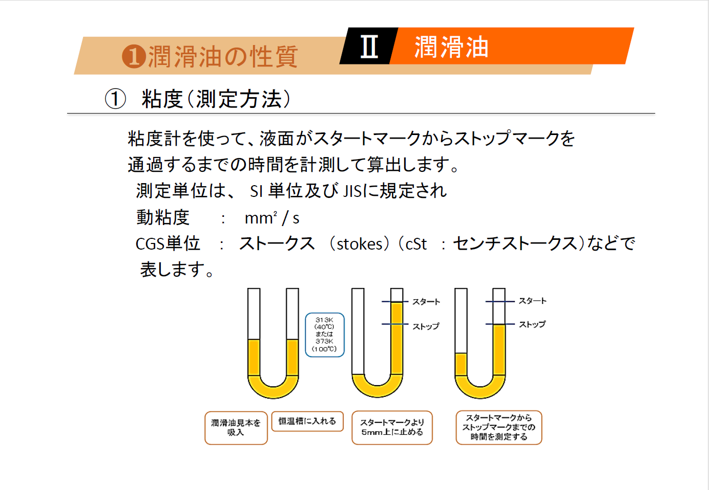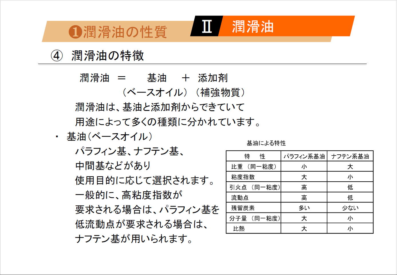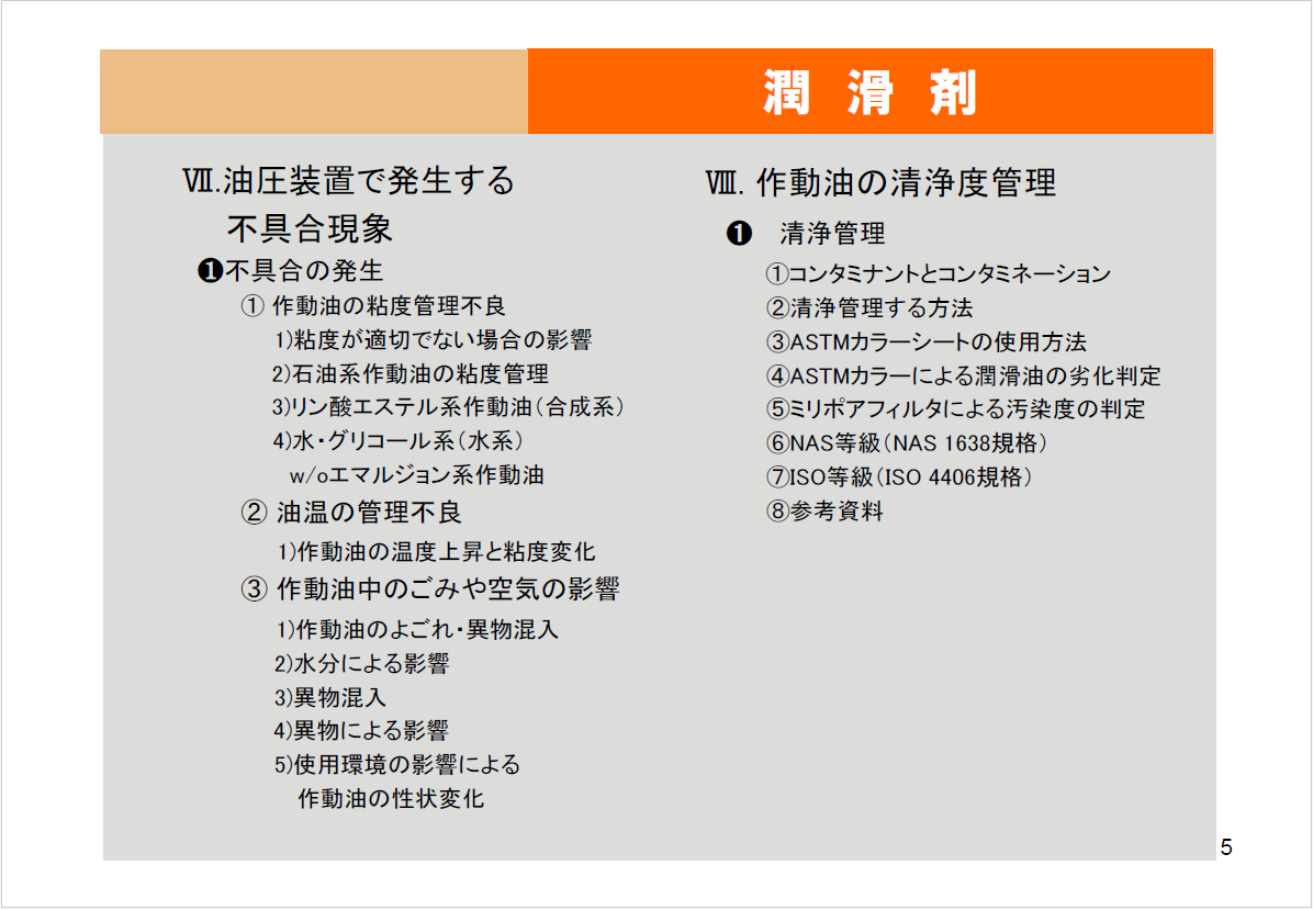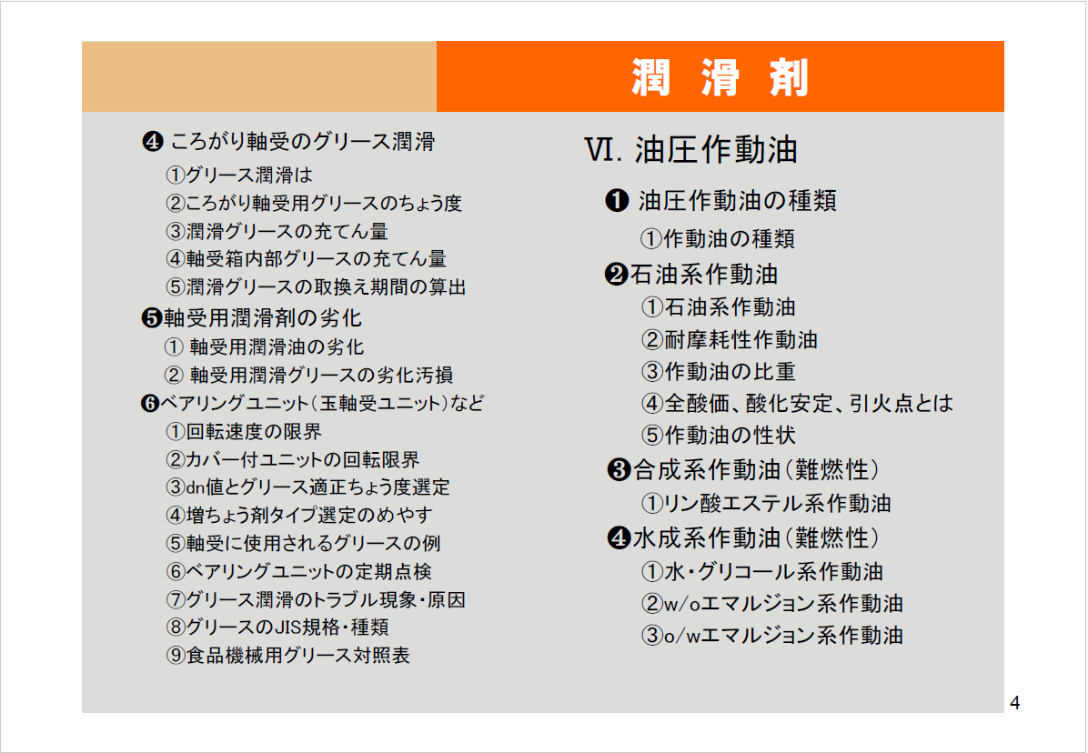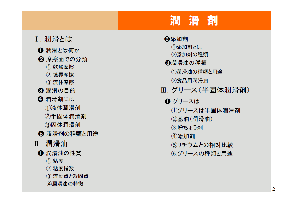 | ➊ 潤滑油の性質 ① 粘度 ➁ 粘度指数 ③ 流動点と凝固点 ④ 潤滑油の特徴 ➋ 添加剤 ① 添加剤とは ② 添加剤の種類 ➌ 潤滑油の種類 ① 潤滑油の種類と用途 ② 食品用潤滑油 |