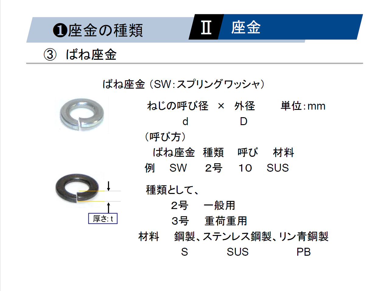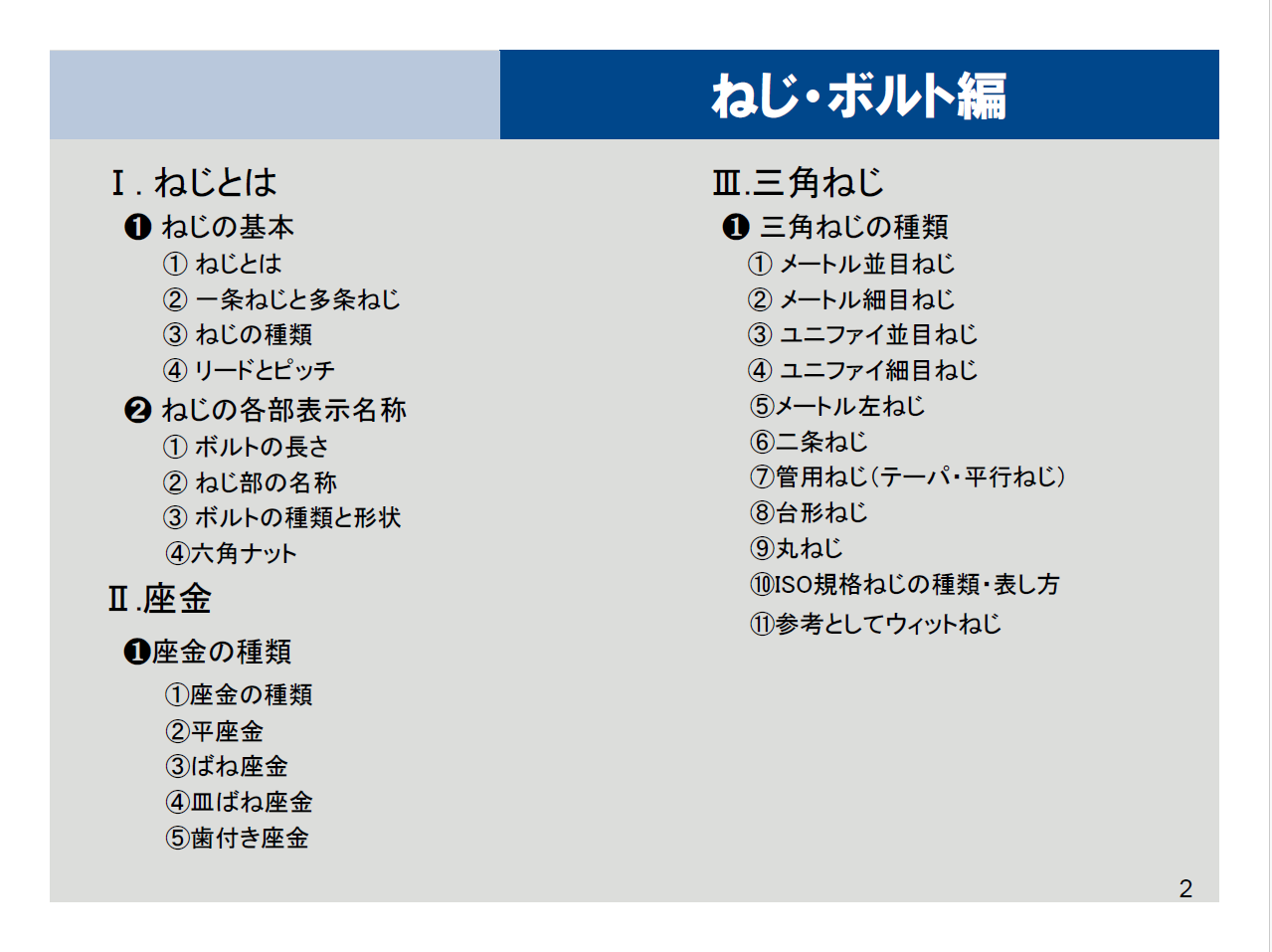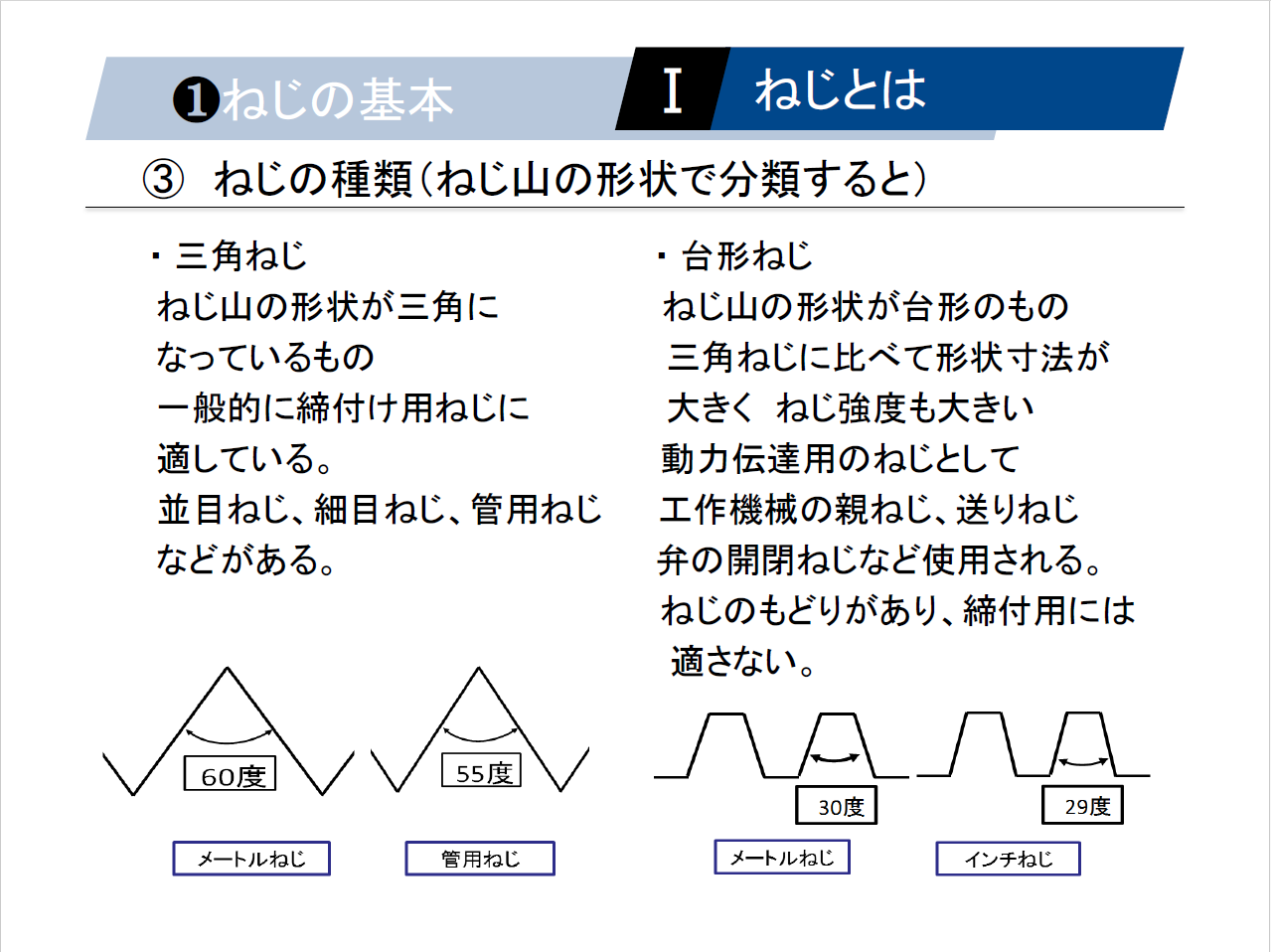 本テキストでは、ねじ・ボルトの各部の名称、種類、形状などを図解にて理解しやすいように説明しております。